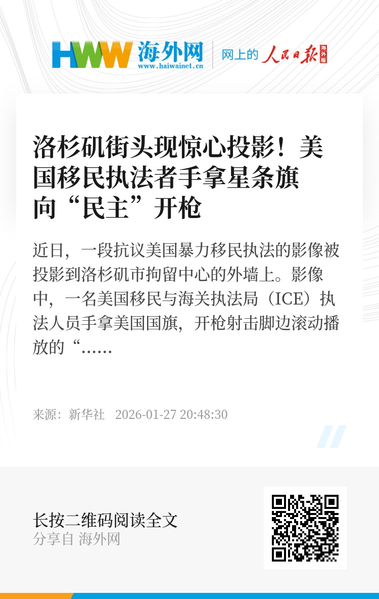 一个月内,美国联邦政府执法人员在针对移民的行动中相继开枪打死两名美国公民。1月7日,ICE执法人员抓捕非法移民时,连开多枪打死美国公民蕾恩·妮科尔·古德。1月24日,在距离古德死亡现场约2公里的地方,ICE执法人员开枪打死美国籍男子亚历克斯·普雷蒂。接连两起街头斩杀事件引发全美范围的大规模抗议,反对暴力执法。(视频:周啸天)
