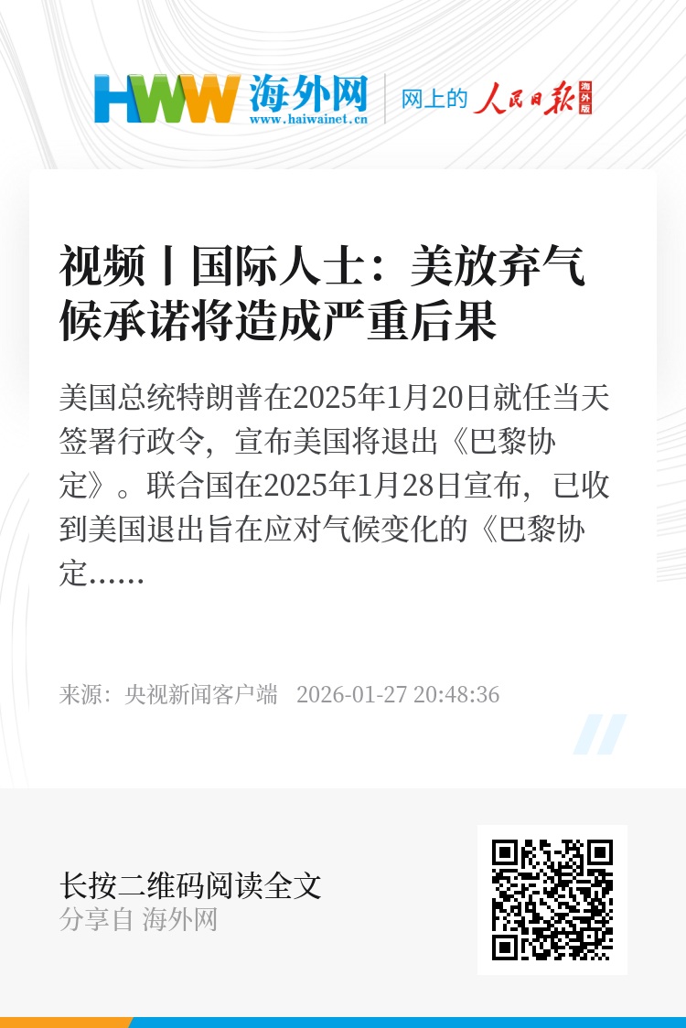 国际人士表示,美国再次退出《巴黎协定》是对多边主义的又一次破坏。美国放弃气候承诺,将造成严重后果。
