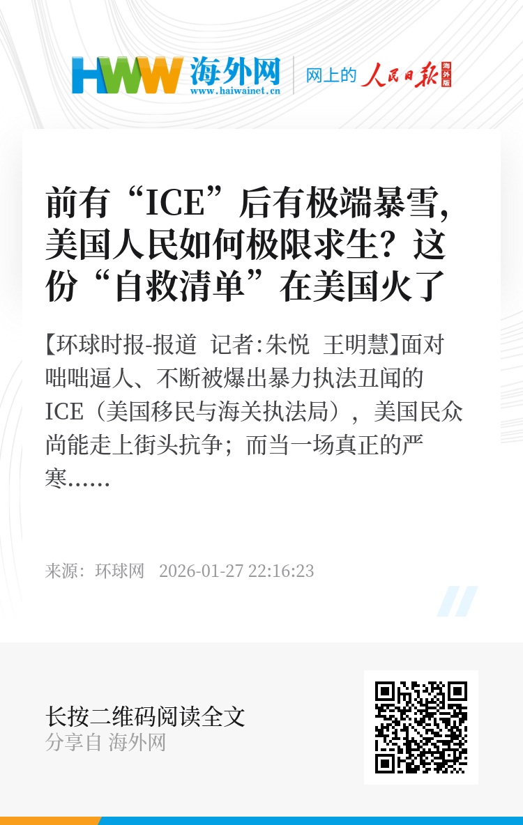 【环球时报-环球网报道 记者:朱悦 王明慧】面对咄咄逼人、不断被爆出暴力执法丑闻的 ICE(美国移民与海关执法局),美国民众尚能走上街头抗争;而当一场真正的严寒冰雪突然降临,美国民众却无奈用讽刺和调侃来掩饰对现实的无能为力。