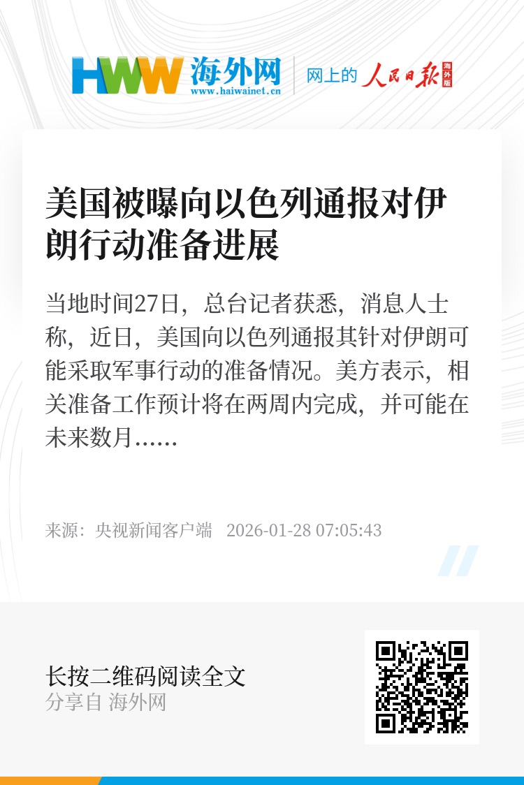 当地时间27日,总台记者获悉,消息人士称,近日,美国向以色列通报其针对伊朗可能采取军事行动的准备情况。美方表示,相关准备工作预计将在两周内完成,并可能在未来数月内出现适合采取行动的“机会窗口”。