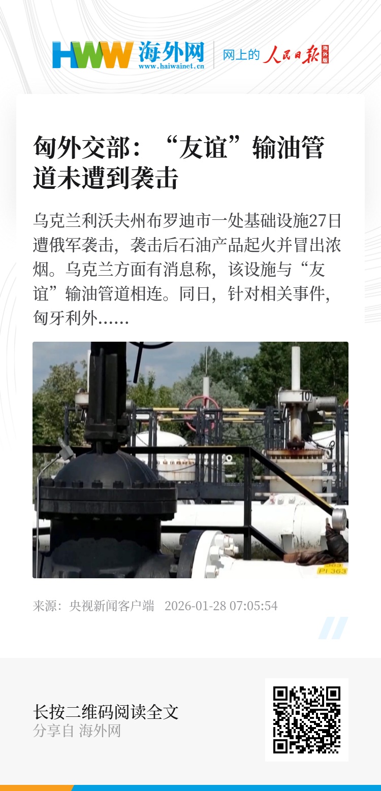 同日,针对相关事件,匈牙利外交与对外经济部发言人表示,根据其掌握的信息,“友谊”输油管道本身并未遭到袭击。
