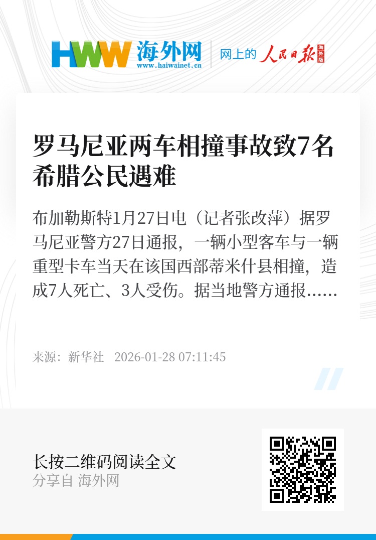 新华社布加勒斯特1月27日电(记者张改萍)据罗马尼亚警方27日通报,一辆小型客车与一辆重型卡车当天在该国西部蒂米什县相撞,造成7人死亡、3人受伤。