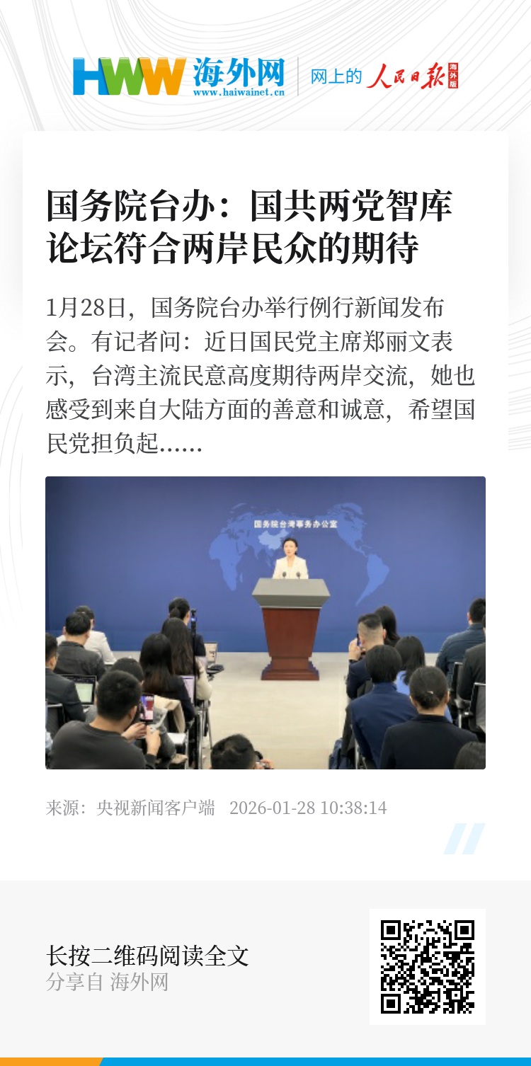 发言人张晗表示, 要和平、要发展、要交流、要合作是岛内主流民意。我们愿在坚持“九二共识”、反对“台独”共同政治基础上,同包括国民党在内的台湾各政党团体和各界人士一道加强交流交往,保持良性互动,共同推动两岸关系和平发展,造福两岸同胞。即将举办的国共两党智库论坛,正是两党为台海谋和平、为民众谋福祉、为民族谋复兴的具体体现,符合岛内主流民意,符合两岸民众的期待。(总台央视记者 赵超逸 黄惠馨)