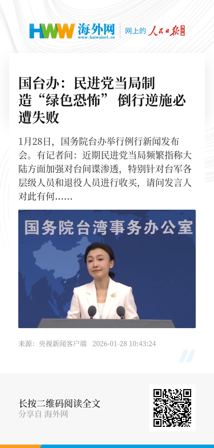 发言人张晗表示,民进党当局为了一党政治私利和“台独”妄想,一再编造谎言、欺骗恐吓台湾民众,以渎职罪名打压政治异己,肆意操弄司法,制造“绿色恐怖”,在岛内激起越来越多的民怨与反对,其倒行逆施必遭失败。