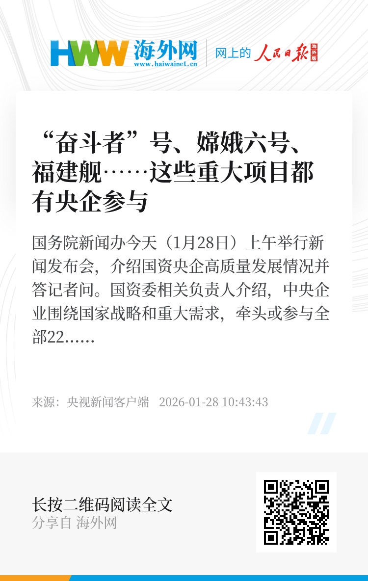 国资委相关负责人介绍,中央企业围绕国家战略和重大需求,牵头或参与全部22个国家重大科技专项,攻克领跑技术121项,“奋斗者”号、嫦娥六号、“梦想”号等一批“大国重器”捷报频传,天问二号、首艘电磁弹射型航母等重大创新成果竞相涌现。(总台央视记者 古峻岭)