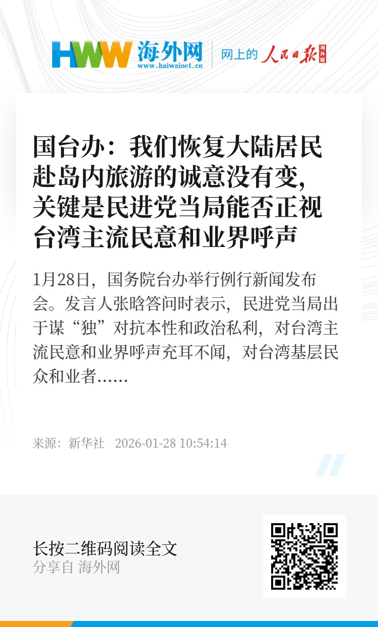 1月28日,国务院台办举行例行新闻发布会。发言人张晗答问时表示,民进党当局出于谋“独”对抗本性和政治私利,对台湾主流民意和业界呼声充耳不闻,对台湾基层民众和业者利益受损视而不见,一再以各种借口对旅游和各领域交流阻挠禁限、设卡立障,不得人心。岛内业界对此已经表示极度失望和强烈愤慨。如不改弦更张,一味私心自用,必将更失人心、自食恶果。