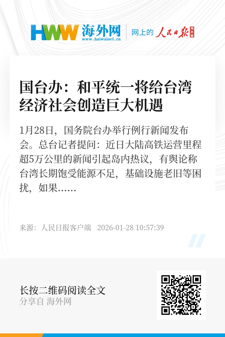1月28日,国务院台办举行例行新闻发布会。总台记者提问:近日大陆高铁运营里程超5万公里的新闻引起岛内热议,有舆论称台湾长期饱受能源不足,基础设施老旧等困扰,如果引进大陆的资金技术,打通中央山脉,改善华东交通等都不是问题。从花莲、台东回台北也再也不必担心路段山崩,那才是真正的安全感。也有网友表示,期待有朝一日可以搭乘高铁横跨台湾海峡,往来两岸,想请问发言人对此有何评论?