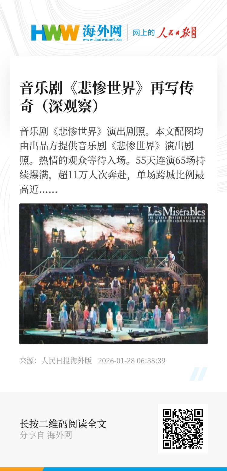 55天连演65场持续爆满,超11万人次奔赴,单场跨城比例最高近70%,衍生品销售额近2000万元……2025年岁末,音乐剧《悲惨世界》40周年纪念版音乐会世界巡演中国站,在上海大剧院落下帷幕。此轮观演热不仅刷新了该剧在中国市场的驻演纪录,也充分展现了中国音乐剧市场的蓬勃活力。