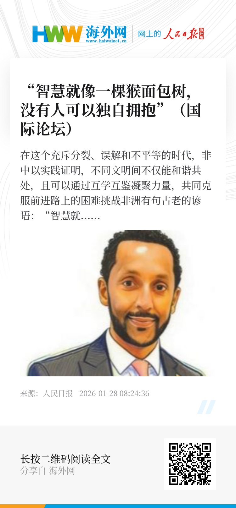 非洲有句古老的谚语:“智慧就像一棵猴面包树,没有人可以独自拥抱。”它生动揭示了一个规律:当不同文明互相借鉴,各国民众之间建立包容、理解与信任的纽带时,文明便能蓬勃发展。