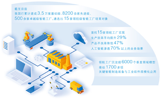 截至目前,全国已累计建成3.5万家基础级、8200余家先进级、500余家卓越级智能工厂,并遴选出15家领航级智能工厂培育对象。