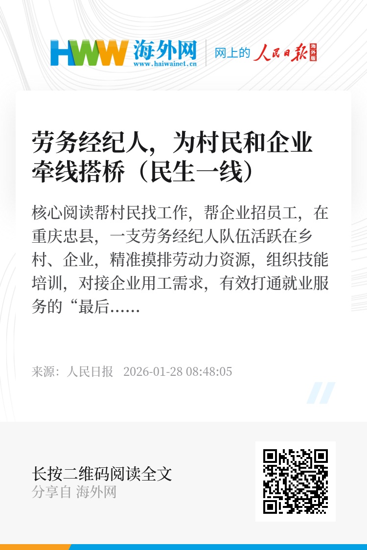 仅2025年,忠县的劳务经纪人就成功推动全县13193名农村劳动力转移就业,其中超60%实现稳定就业。重庆市按照“一镇街至少一人”标准培育专职劳务经纪人1100余人,“一村社至少一人”标准培育兼职劳务经纪人2.2万余人,专业化农村劳务服务队伍越来越壮大。(记者 沈靖然)