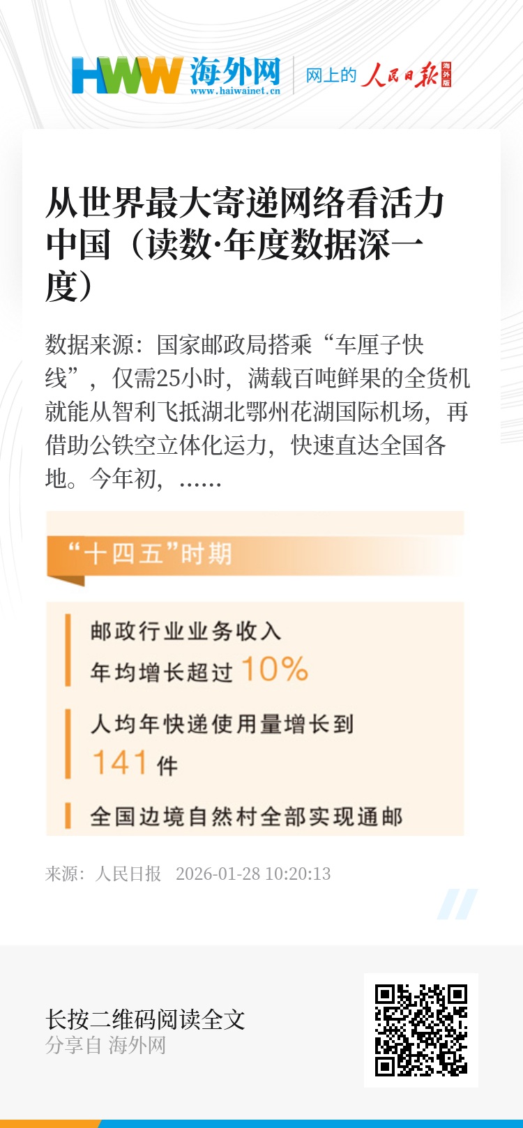 这只是中国物流新速度的一个切面。新速度背后是一张世界上规模最大、受益人数最多的寄递网络:2025年,中国快递业务量近2000亿件,同比增长13.6%,连续12年位居世界第一。“十四五”时期,农村和边境地区邮政通达广度深度明显提升,营业网点数量较5年前增长近1.5倍,全国边境自然村全部实现通邮。