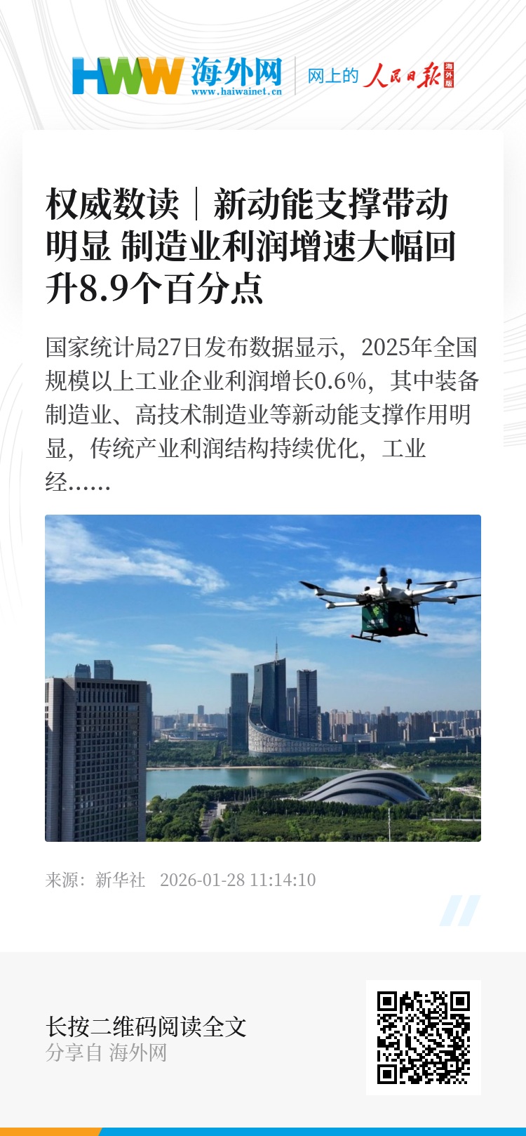 国家统计局27日发布数据显示,2025年全国规模以上工业企业利润增长0.6%,其中装备制造业、高技术制造业等新动能支撑作用明显,传统产业利润结构持续优化,工业经济发展向新向优。跟随海报,一起了解。