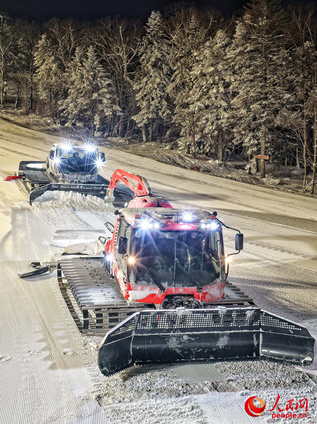 张斌驾驶压雪机在雪场内平整雪道。人民网记者李洋摄