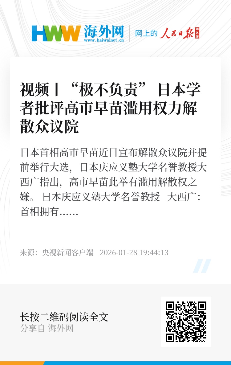 日本首相高市早苗近日宣布解散众议院并提前举行大选,日本庆应义塾大学名誉教授大西广指出,高市早苗此举有滥用解散权之嫌。