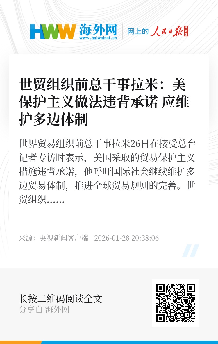 世贸组织前总干事 拉米:我认为我们都应该保持冷静,不要沉溺于美国国内出现的那种贸易保护主义狂热。美国的行为并不符合其在世界贸易组织中所作出的承诺。即便没有美国,我们也可以推进全球贸易规则的完善。