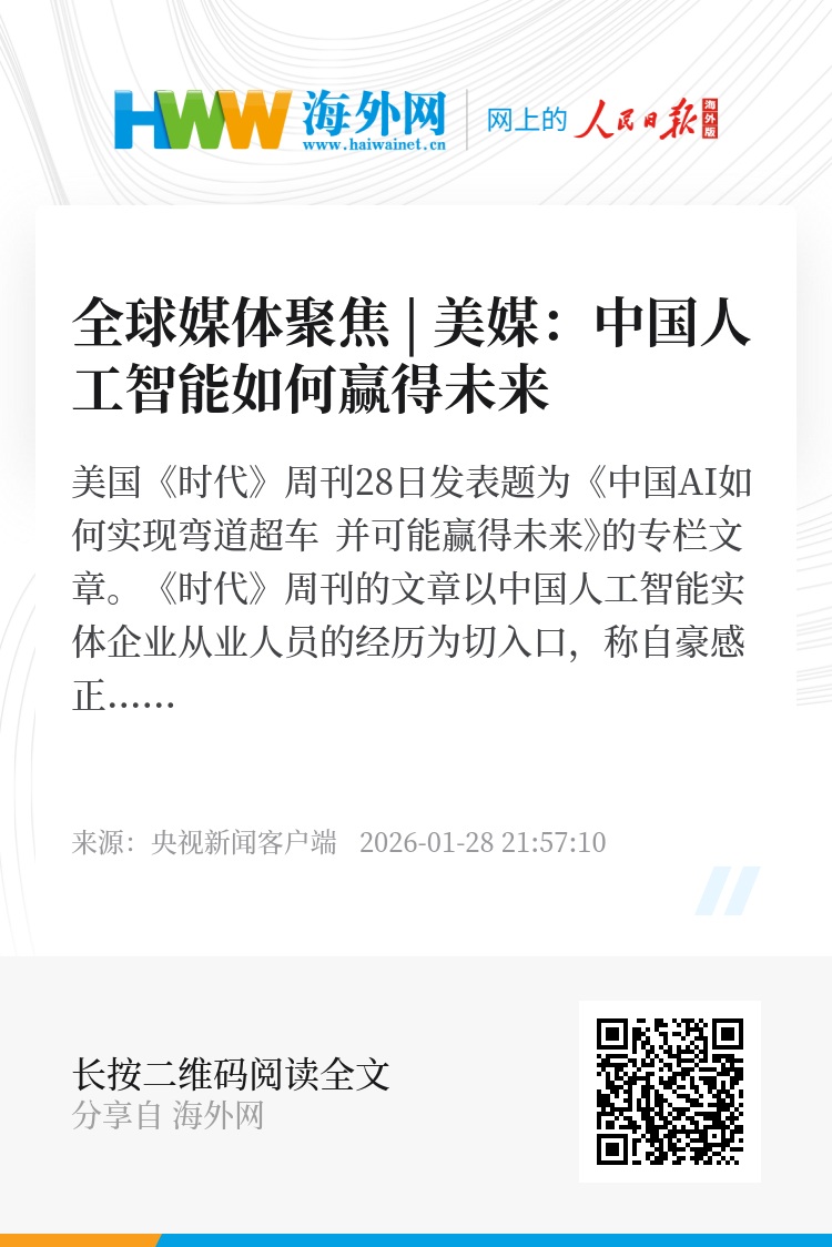 美国《时代》周刊28日发表题为《中国AI如何实现弯道超车 并可能赢得未来》的专栏文章。