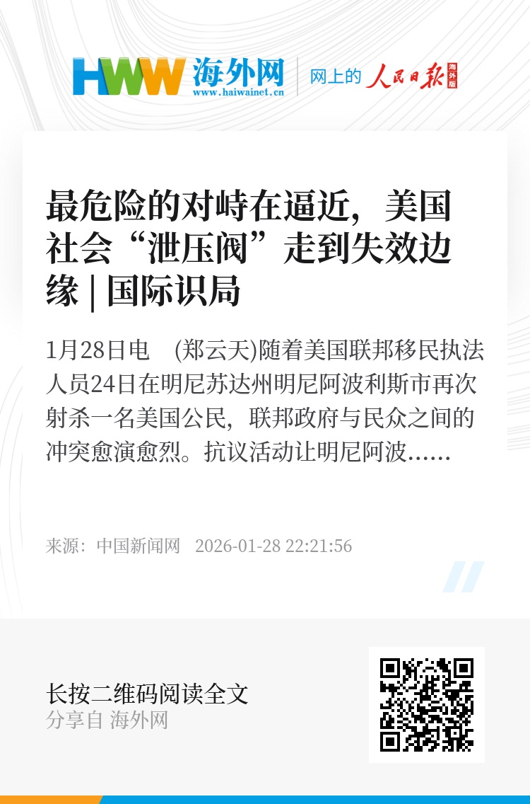 中新网1月28日电 (郑云天)随着美国联邦移民执法人员24日在明尼苏达州明尼阿波利斯市再次射杀一名美国公民,联邦政府与民众之间的冲突愈演愈烈。