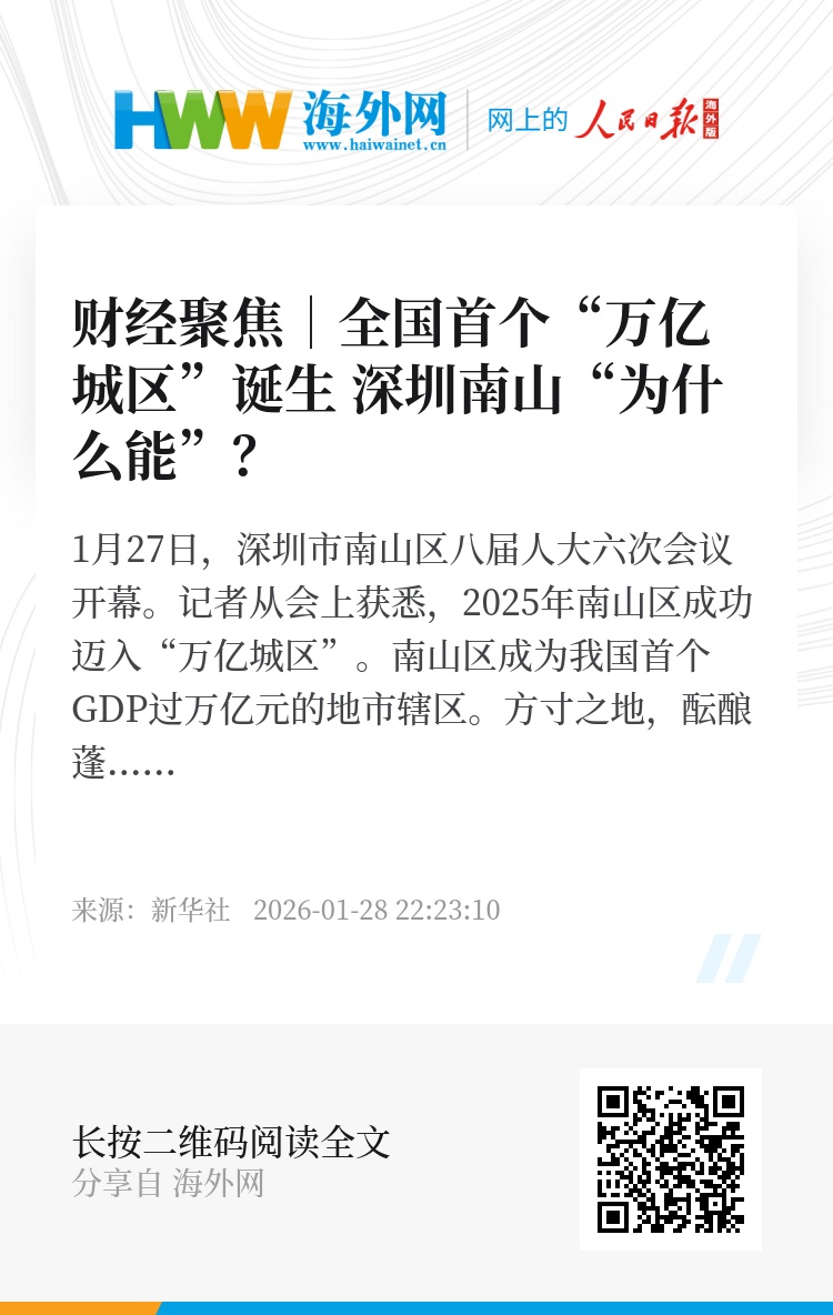 1月27日,深圳市南山区八届人大六次会议开幕。记者从会上获悉,2025年南山区成功迈入“万亿城区”。南山区成为我国首个GDP过万亿元的地市辖区。