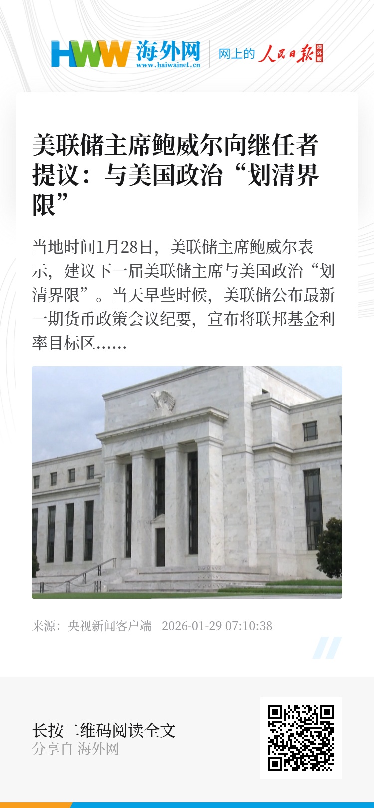 当地时间1月28日,美联储主席鲍威尔表示,建议下一届美联储主席与美国政治“划清界限”。