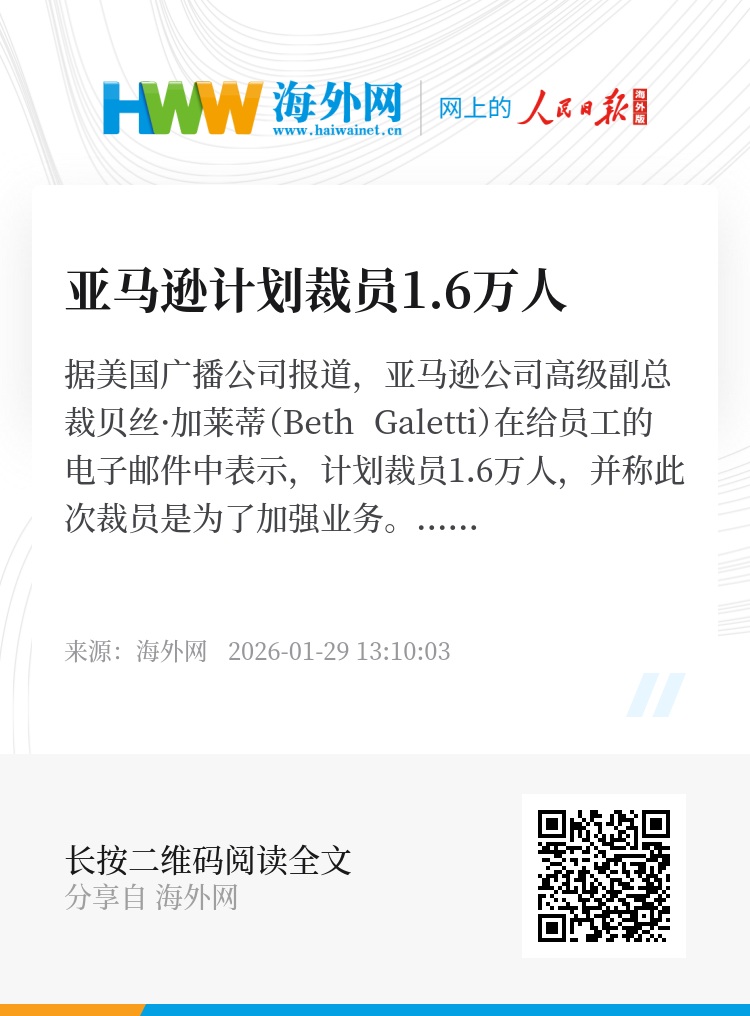 海外网1月29日电 据美国广播公司报道,亚马逊公司高级副总裁贝丝·加莱蒂(Beth Galetti)在给员工的电子邮件中表示,计划裁员1.6万人,并称此次裁员是为了加强业务。