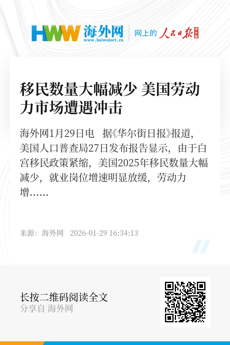 海外网1月29日电 据《华尔街日报》报道,美国人口普查局27日发布报告显示,由于白宫移民政策紧缩,美国2025年移民数量大幅减少,就业岗位增速明显放缓,劳动力增长乏力或将对美国经济造成严重负面影响。