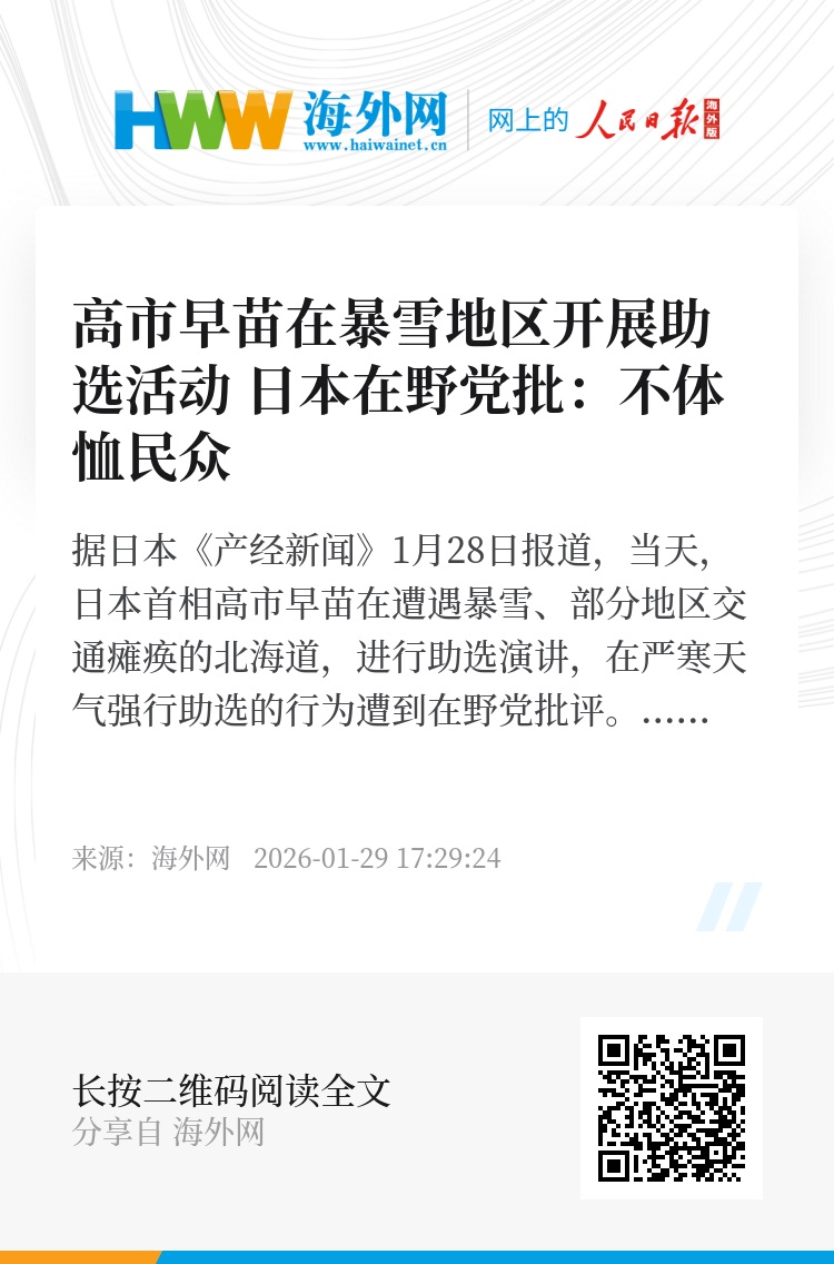 海外网1月29日电 据日本《产经新闻》1月28日报道,当天,日本首相高市早苗在遭遇暴雪、部分地区交通瘫痪的北海道,进行助选演讲,在严寒天气强行助选的行为遭到在野党批评。