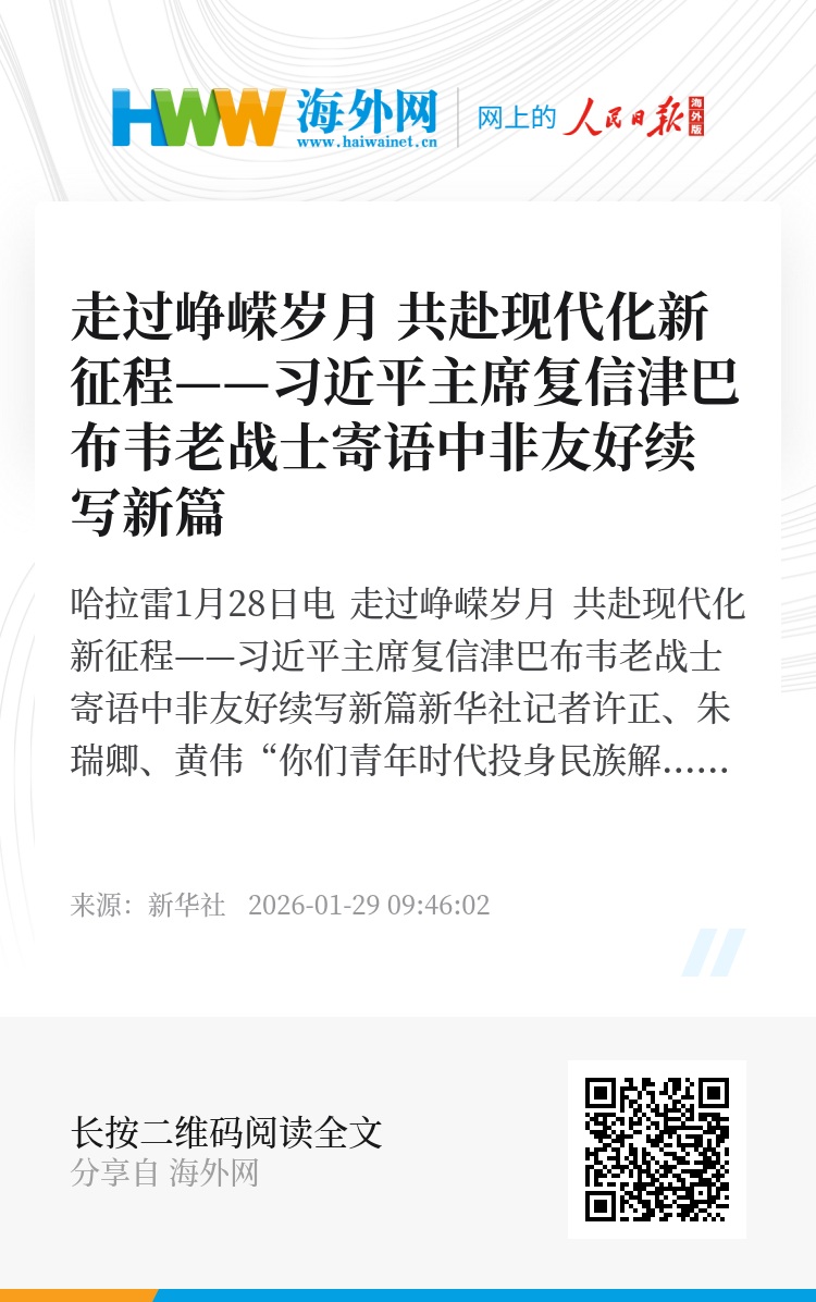 新华社哈拉雷1月28日电 走过峥嵘岁月 共赴现代化新征程——习近平主席复信津巴布韦老战士寄语中非友好续写新篇