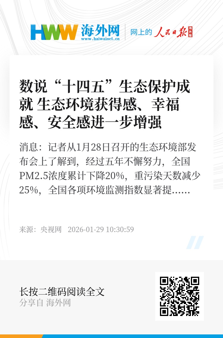 “十四五”期间,全国PM2.5浓度累计下降20%,优良天数比例创有监测以来最好水平,重污染天数减少25%;全国地表水Ⅰ—Ⅲ类水质断面比例累计上升8个百分点,长江干流连续6年、黄河干流连续4年全线水质稳定保持Ⅱ类,太湖连续2年水质达到Ⅲ类;近岸海域水质优良比例较2020年提高7.5个百分点,主要污染物排放总量持续下降,实现空气质量、水环境质量、城乡人居环境“三个明显改善”和重污染天气、劣Ⅴ类断面、城市黑臭水体“三个基本消除”,人民群众生态环境满意度连续4年超过90%,生态环境获得感、幸福感、安全感进一步增强。