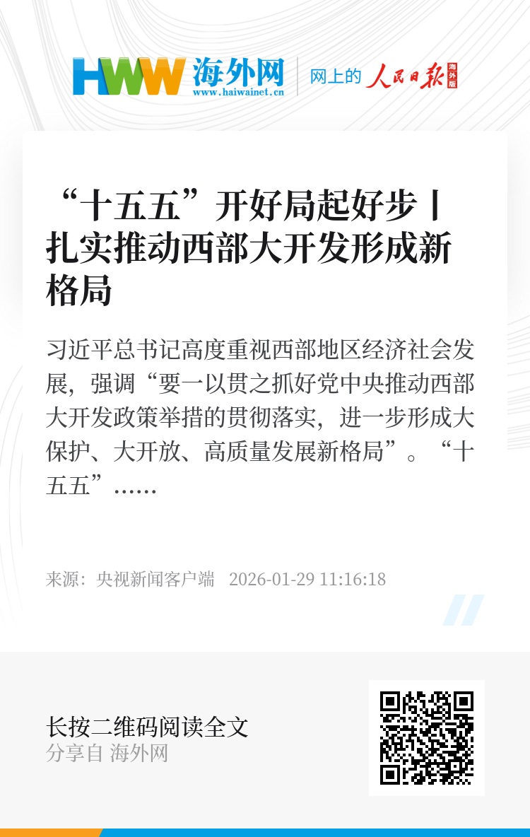 习近平总书记高度重视西部地区经济社会发展,强调“要一以贯之抓好党中央推动西部大开发政策举措的贯彻落实,进一步形成大保护、大开放、高质量发展新格局”。“十五五”开局之年,西部地区发挥比较优势,各展所长,因地制宜发展新质生产力,以大开放促进大开发,不断提升区域整体实力和可持续发展能力,在中国式现代化建设中奋力谱写西部大开发新篇章。