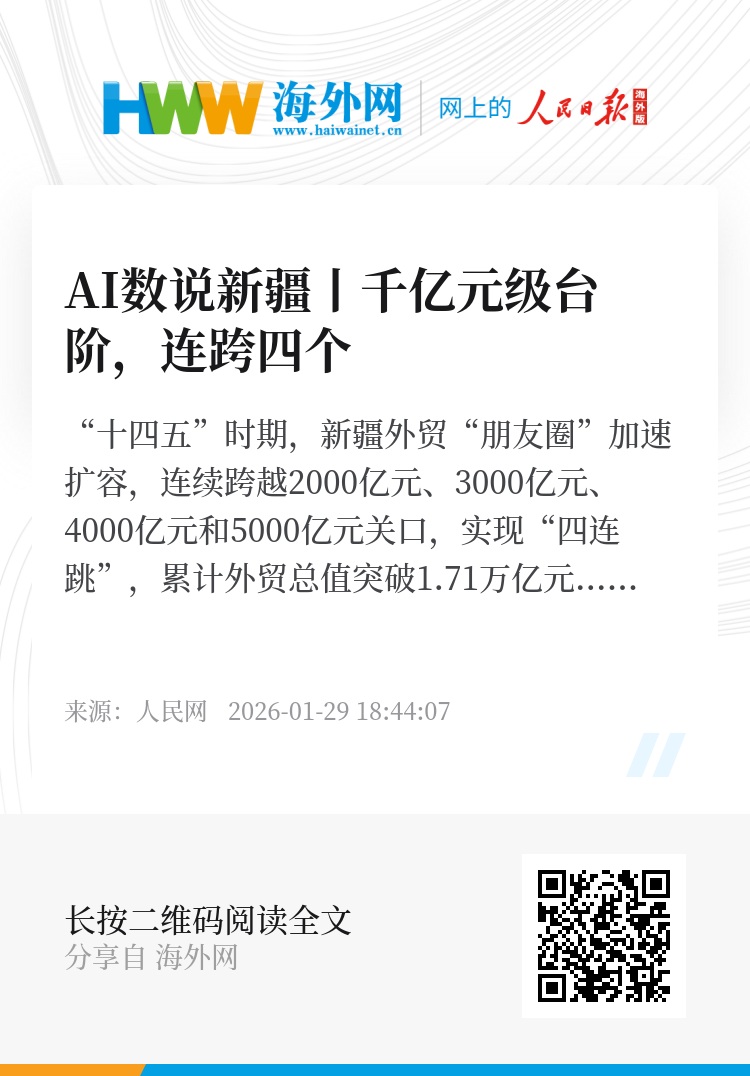“十四五”时期,新疆外贸“朋友圈”加速扩容,连续跨越2000亿元、3000亿元、4000亿元和5000亿元关口,实现“四连跳”,累计外贸总值突破1.71万亿元,较“十三五”时期增长144.3%。新疆以改革创新为驱动,在各口岸落地多项“全国首个”“新疆首个”开放举措,创下多个全国之最:五年内外贸增速三次领跑、过境中欧(中亚)班列最多、建成最大汽车出口陆路口岸……新疆正以更高水平开放塑造发展新动能,锚定打造亚欧黄金通道和向西开放桥头堡。
