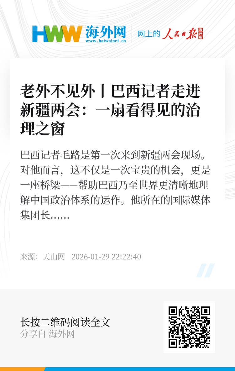巴西记者毛路是第一次来到新疆两会现场。对他而言,这不仅是一次宝贵的机会,更是一座桥梁——帮助巴西乃至世界更清晰地理解中国政治体系的运作。他所在的国际媒体集团长期关注“新时代中国特色社会主义”的发展实践,因而能够实地见证并报道这样的重要政治活动,显得尤为关键——在会场中,他不仅能触摸中国发展的脉搏,更能亲身感受中国政治体系的逻辑与蓬勃活力。