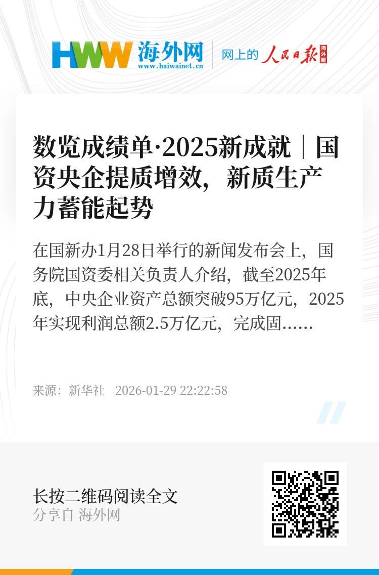 在国新办1月28日举行的新闻发布会上,国务院国资委相关负责人介绍,截至2025年底,中央企业资产总额突破95万亿元,2025年实现利润总额2.5万亿元,完成固定资产投资5.1万亿元,上交税费2.5万亿元,有效带动产业链上下游企业融通发展,为我国顺利完成经济社会发展主要目标任务提供了有力支撑。