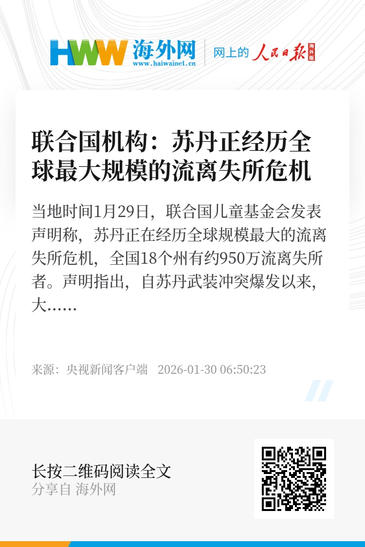 当地时间1月29日,联合国儿童基金会发表声明称,苏丹正在经历全球规模最大的流离失所危机,全国18个州有约950万流离失所者。