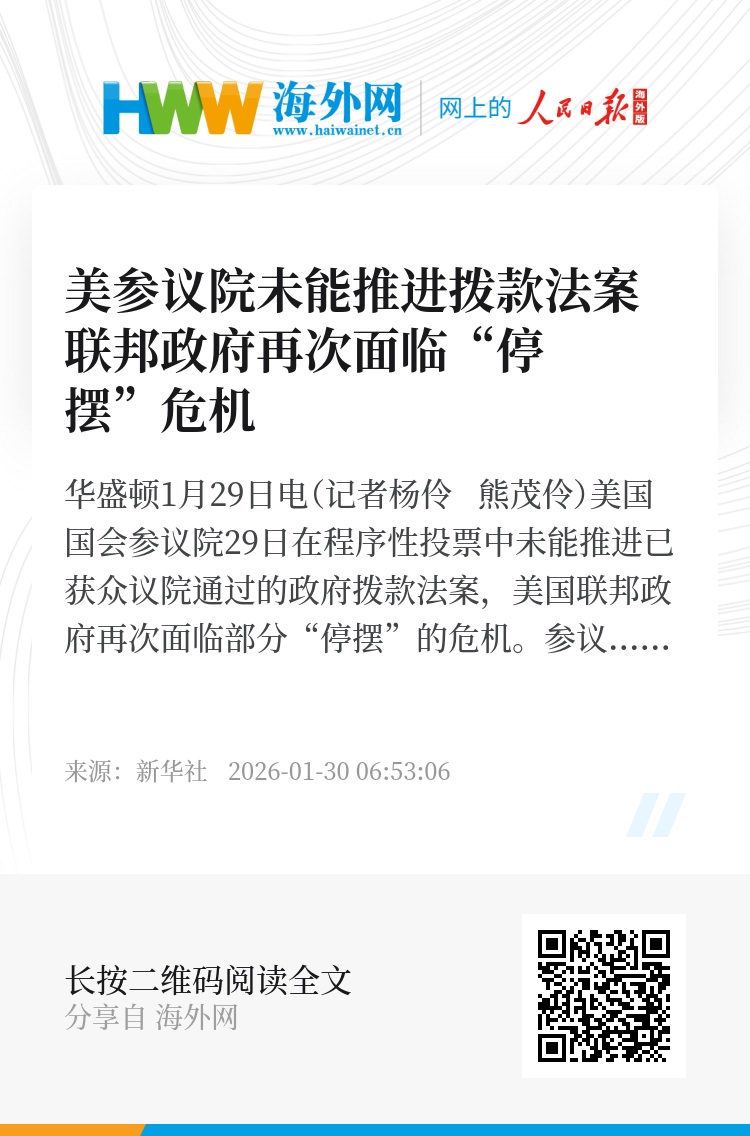 新华社华盛顿1月29日电(记者杨伶 熊茂伶)美国国会参议院29日在程序性投票中未能推进已获众议院通过的政府拨款法案,美国联邦政府再次面临部分“停摆”的危机。