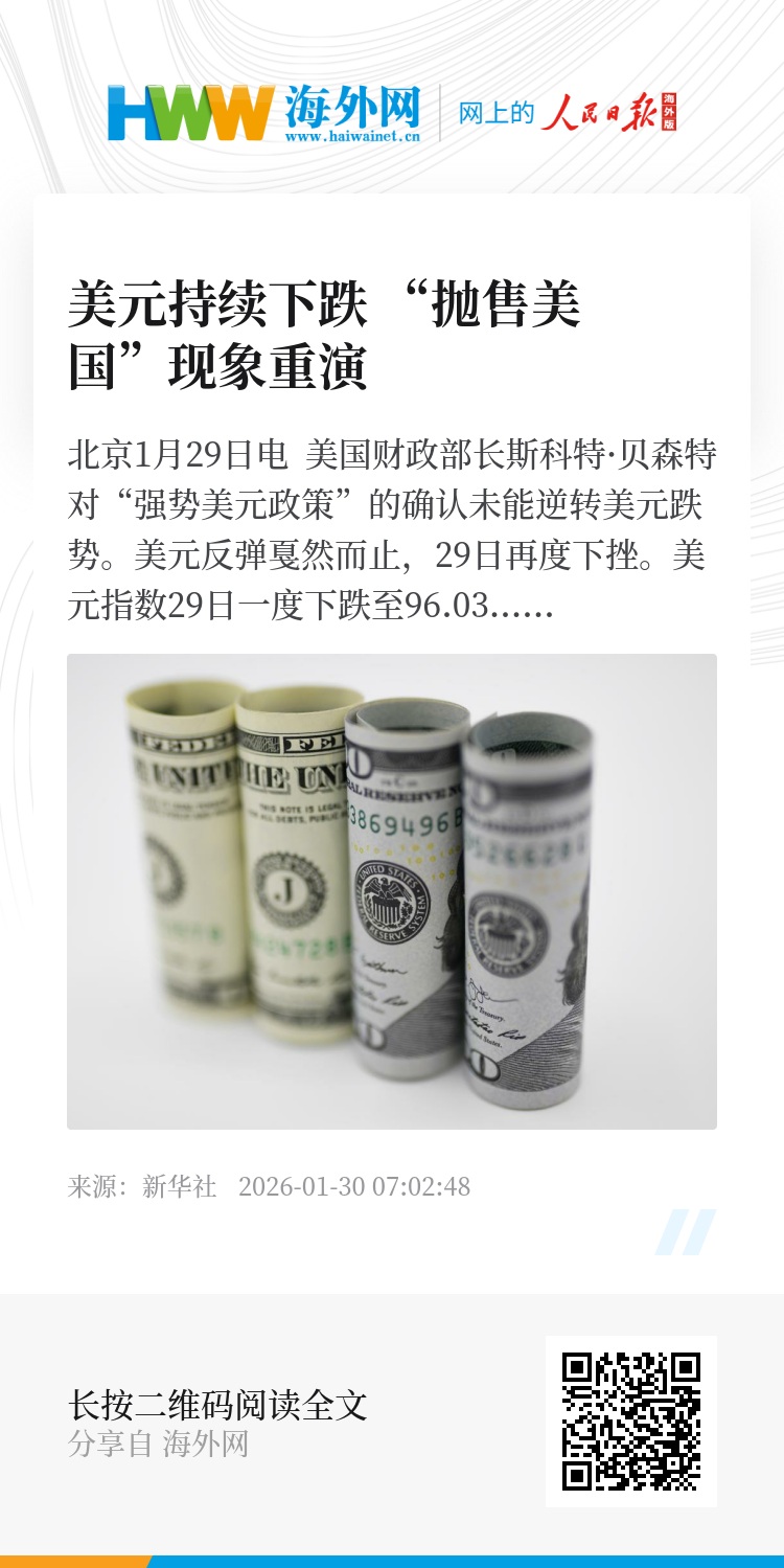 新华社北京1月29日电 美国财政部长斯科特·贝森特对“强势美元政策”的确认未能逆转美元跌势。美元反弹戛然而止,29日再度下挫。