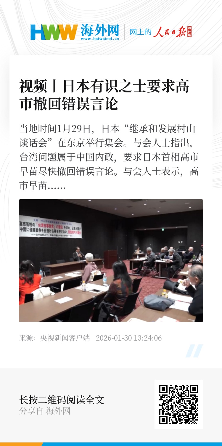 当地时间1月29日,日本“继承和发展村山谈话会”在东京举行集会。与会人士指出,台湾问题属于中国内政,要求日本首相高市早苗尽快撤回错误言论。