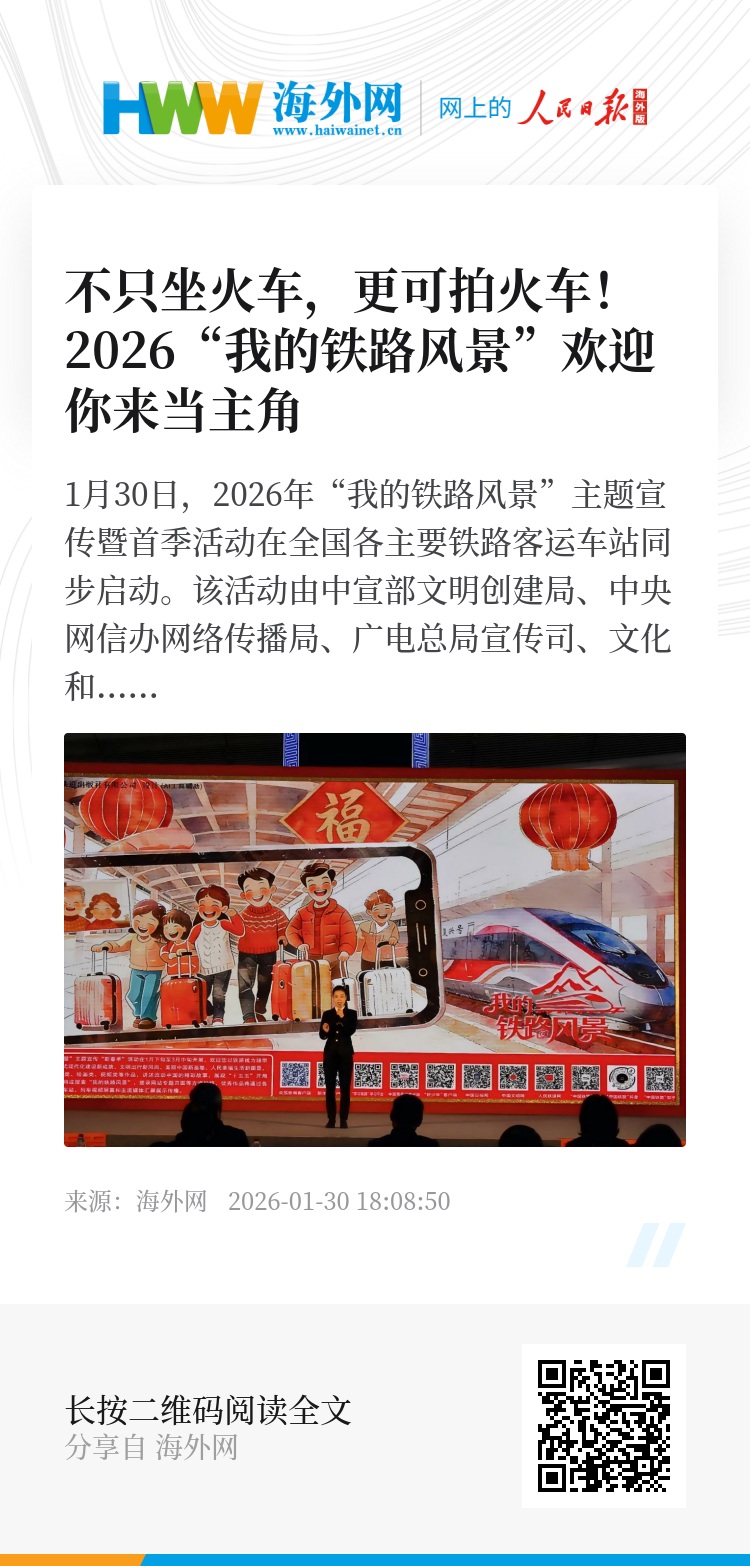 1月30日,2026年“我的铁路风景”主题宣传暨首季活动在全国各主要铁路客运车站同步启动。该活动由中宣部文明创建局、中央网信办网络传播局、广电总局宣传司、文化和旅游部资源开发司、中国文联国内联络部、中国作协创作联络部、国家铁路集团党组宣传部联合举办,旨在通过群众视角,以铁路为纽带,展现国家发展、文化魅力与生活变迁。