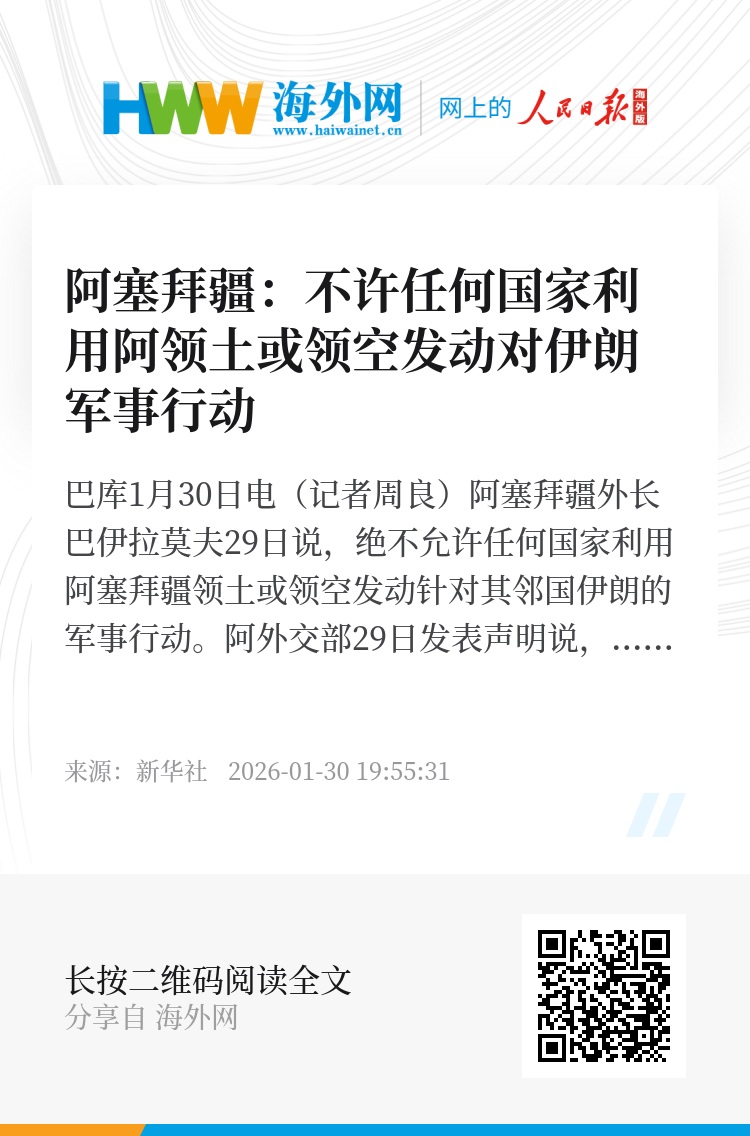 新华社巴库1月30日电(记者周良)阿塞拜疆外长巴伊拉莫夫29日说,绝不允许任何国家利用阿塞拜疆领土或领空发动针对其邻国伊朗的军事行动。