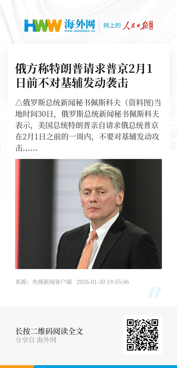 当地时间30日,俄罗斯总统新闻秘书佩斯科夫表示,美国总统特朗普亲自请求俄总统普京在2月1日之前的一周内,不要对基辅发动攻击,以便为谈判创造有利条件。