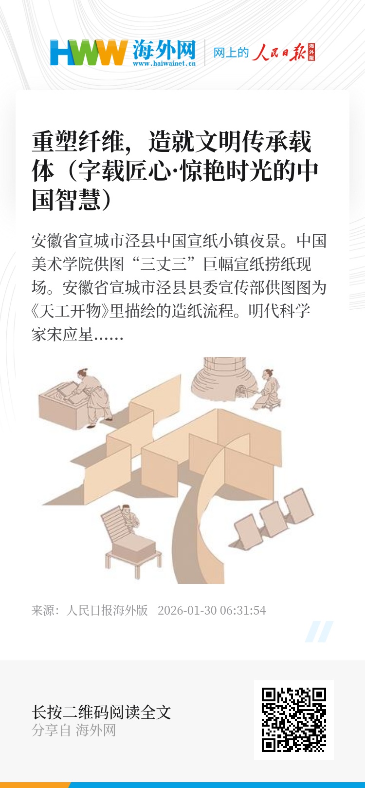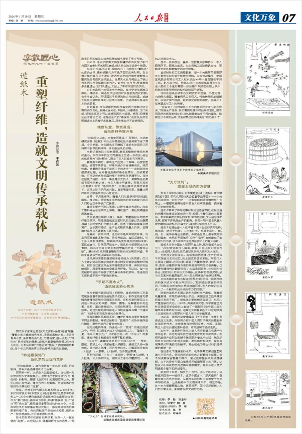取原材于自然,精技艺于百代。创人之所未有,泽被五洲四海——造纸术,这项中国古人“顺天造物”智慧孕育出的伟大发明,从最朴实的材料中造就便于文字书写的纸张,让浩瀚的中华文明传承千年,绵延不绝。这一东方智慧跨越山海,惠及世界,至今仍深深嵌入人们的日常生活,影响着世界文明的发展。(本报记者 于尚波)