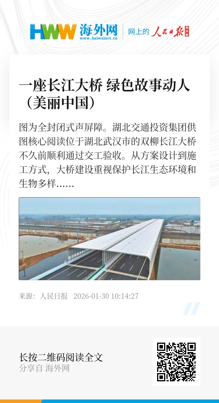 “这是专门为涨渡湖湿地鸟类修建的声屏障,长400米、高6.38米、横跨34米。”彭晓彬介绍,为飞鸟建“屏障之桥”,这在长江桥梁建设中尚属首次。