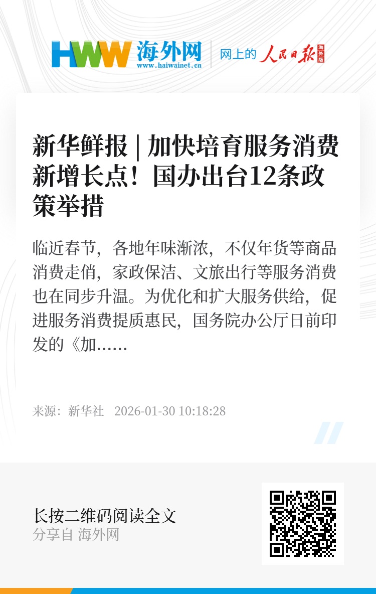 为优化和扩大服务供给,促进服务消费提质惠民,国务院办公厅日前印发的《加快培育服务消费新增长点工作方案》1月29日对外发布,从激发重点领域发展活力、培育潜力领域发展动能、加强支持保障三方面提出12条政策举措。