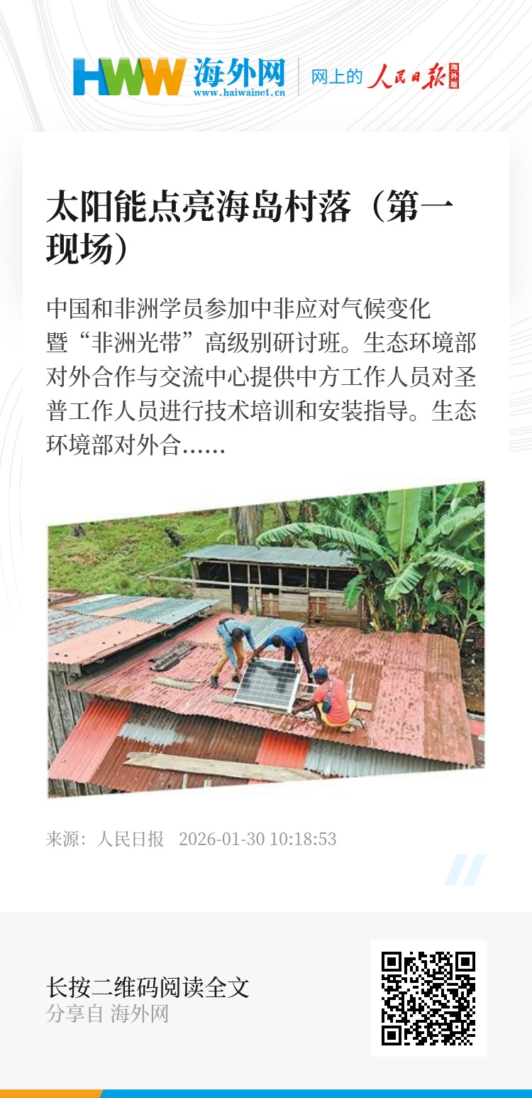 作为中非应对气候变化合作的核心举措之一,“非洲光带”项目精准对接圣普发展需求。“圣普有充足的阳光和水能资源,但能源结构以化石燃料为主,严重制约国家发展。”圣普基础设施部部长卡多佐说,该国已制定2030年前可再生能源比例达50%的目标,“‘非洲光带’项目与我们的可持续发展战略高度契合,为国家能源矩阵建设提供了重要支撑,也为国家可再生能源发展提供了宝贵经验。”