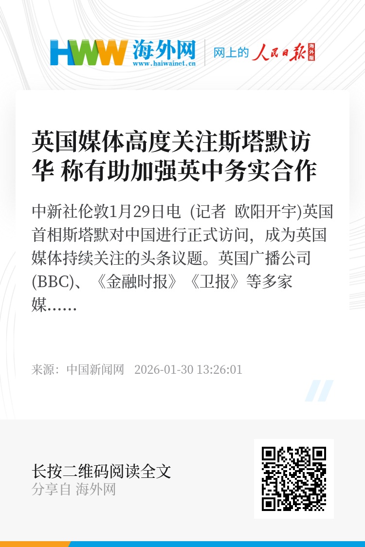 中新社伦敦1月29日电 (记者 欧阳开宇)英国首相斯塔默对中国进行正式访问,成为英国媒体持续关注的头条议题。英国广播公司(BBC)、《金融时报》《卫报》等多家媒体关注到,此访是在英中关系经历多年低谷后展开的重要高层互动,有助于恢复沟通渠道,并推动双方以更加务实、稳定的方式处理双边关系。