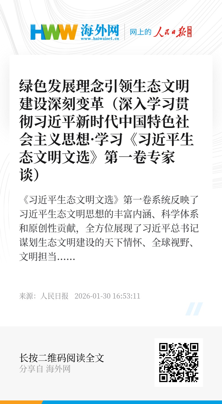 在《以美丽中国建设全面推进人与自然和谐共生的现代化》中,习近平总书记指出:“加快形成绿色生产方式和生活方式,厚植高质量发展的绿色底色。”党的二十届四中全会通过的《中共中央关于制定国民经济和社会发展第十五个五年规划的建议》提出“绿色发展是中国式现代化的鲜明底色”,对“加快经济社会发展全面绿色转型,建设美丽中国”作出战略部署。我们要深入学习《习近平生态文明文选》第一卷,深刻认识绿色发展理念的真理力量、实践伟力和世界贡献,更加自觉地坚持以习近平生态文明思想为指导,全面贯彻落实党的二十届四中全会精神和中央经济工作会议精神,以绿色发展促进人与自然和谐共生,为基本实现社会主义现代化注入强劲绿色动力。