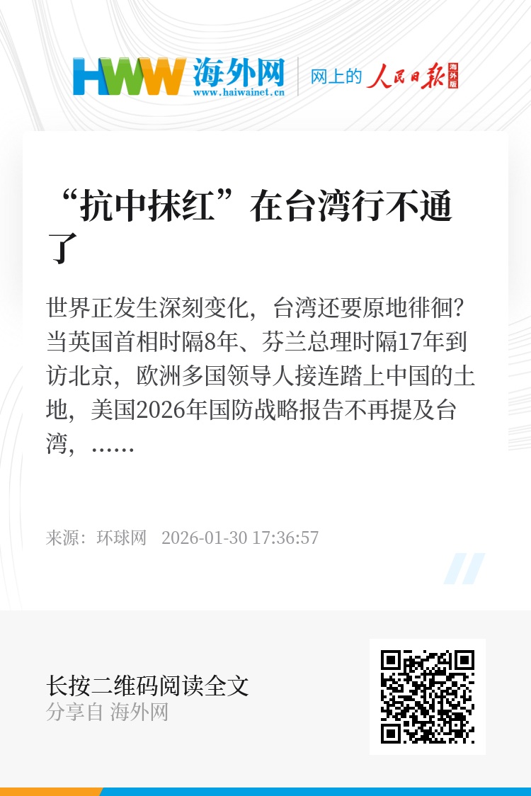 世界正发生深刻变化,台湾还要原地徘徊?当英国首相时隔8年、芬兰总理时隔17年到访北京,欧洲多国领导人接连踏上中国的土地,美国2026年国防战略报告不再提及台湾,美国智库调查中大多数受访者认为美国已不再是“独一无二的超级大国”,台湾一些人却依旧迷失在“抗中抹红”的迷雾中。民进党当局把两岸交流污名化为“统战”,把国共智库的务实对话扭曲为“卖台交易”,甚至将台湾青年渴望赴大陆实习、台企期盼拓展大陆市场、普通民众喜欢使用大陆社交平台等最朴素的民生需求,都定义为“认同红色政权”。这不是守护民主、保卫安全、关心人民,而是用恐惧绑架民意、用谎言腐蚀未来,是在大开历史倒车,让台湾与整个时代脱节。