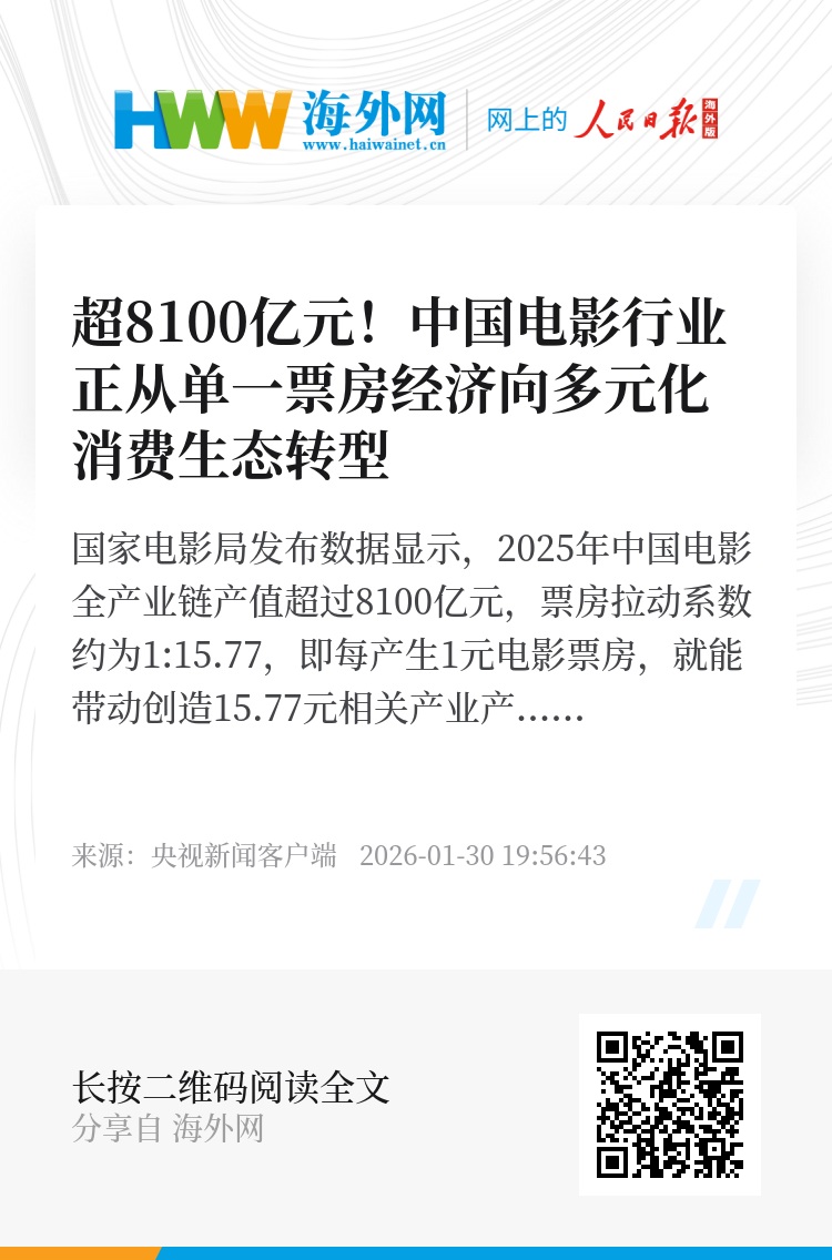 国家电影局发布数据显示,2025年中国电影全产业链产值超过8100亿元,票房拉动系数约为1:15.77,即每产生1元电影票房,就能带动创造15.77元相关产业产值。这两项位居全球前列的数据,印证着中国电影产业发展的强劲活力,表明中国电影行业正从单一票房经济向多元化消费生态转型,为经济发展打开全新的增长空间。