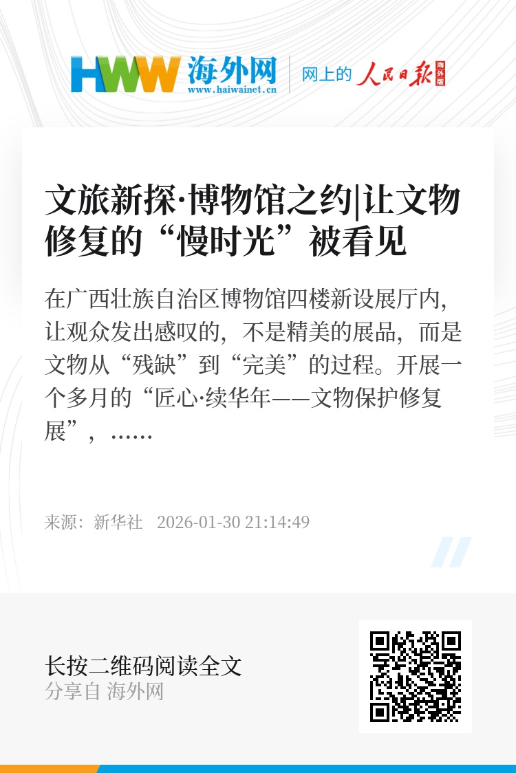 “展览依托馆内文物科技保护中心的专业优势,涵盖书画、古籍、青铜器等多类文物修复案例,兼具科普、交流与传承价值。”广西壮族自治区博物馆副馆长杨清平说,这场展览的核心目的,不止于展示修复技艺,更在于搭建起文化遗产与公众之间的情感桥梁,让每一位观众都能读懂文物背后的坚守与传承。