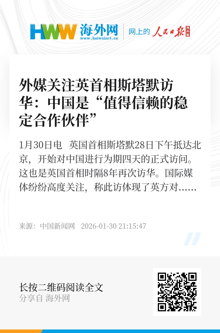 中新网1月30日电 英国首相斯塔默28日下午抵达北京,开始对中国进行为期四天的正式访问。这也是英国首相时隔8年再次访华。国际媒体纷纷高度关注,称此访体现了英方对深化双边经贸关系的强烈期待,中国已成为众多国家眼中值得信赖的稳定合作伙伴。